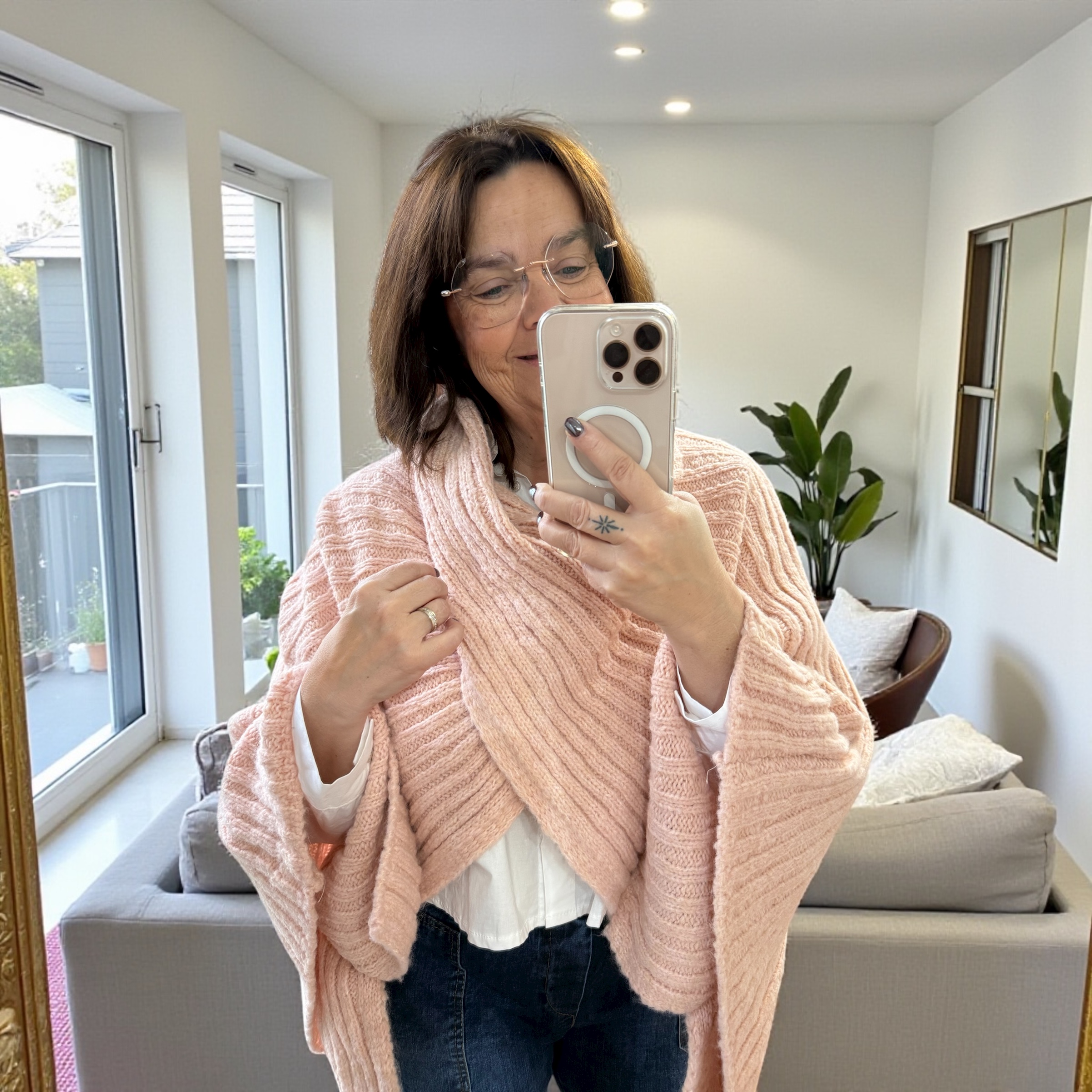Poncho en mailles ultra confo et doux au style drapé élégant. Sa coupe fluide et ses boutons latéraux permettent de le porter ouvert, croisé ou enroulé autour du corps.